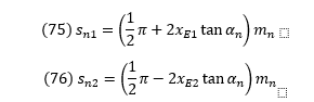 If we use a similar example, with x1 = 0.5, then for (62) to hold, x2 must be equal to 0.5 also. If we then use equations (75) and (76) to calculate the circular tooth thickness, the sum of the tooth thickness equals the circular pitch and we do not have a problem.