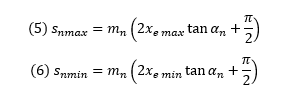 For both internal and external gears, the maximum and minimum nominal normal circular tooth thicknesses are related to the maximum and minimum manufacturing profile shift coefficients using the following relationships: