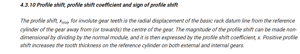 The correct definition of profile shift sign is that moving the generating rack away from the root is a positive profile shift. Unfortunately, AGMA 913 says that moving the generating rack away from the gear center is a positive profile shift,